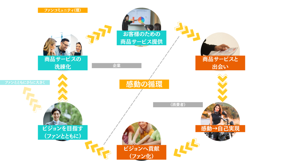 私たちは、人と人、人と企業、人と社会を深く結びつけ、双方が感動による互いへ貢献し合う「感動の循環」が、人々の幸せを最大化すると信じ、その実現を目指しています。そこで生まれたのが「感動マーケティング™」です。
