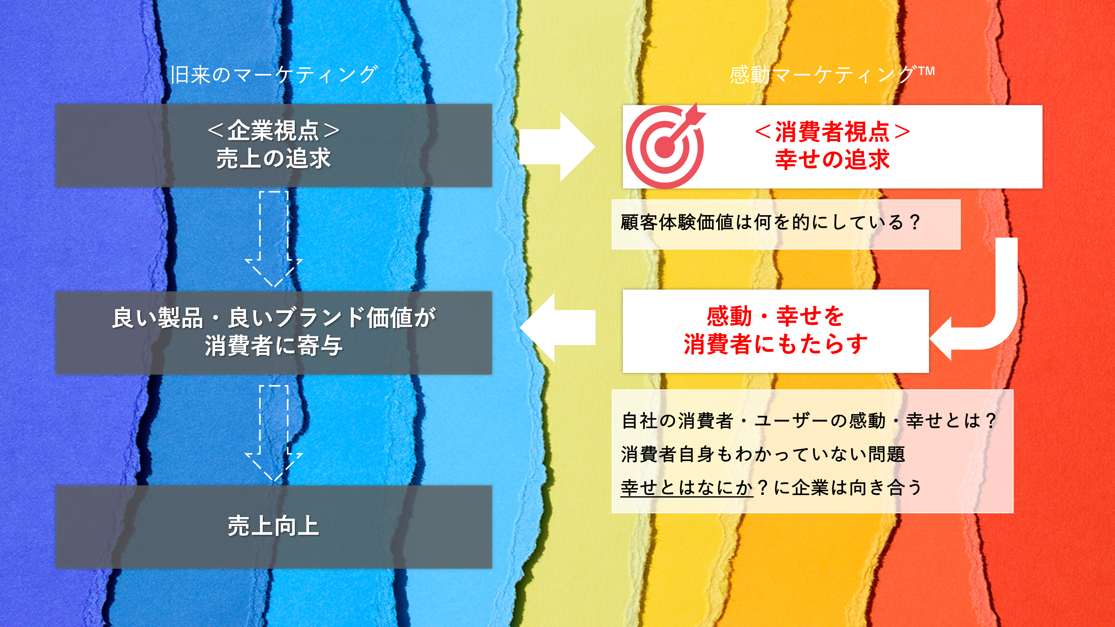 企業は、お客さまの幸せとはなにか?に向き合い、商品サービスを通じて喜びを生み出すことが求められます。感動マーケティング™は、企業とお客さまが”いっしょに生きていく”ための道具といえます。